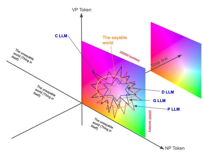 - LLMs 作為 CIEXYZ 色彩空間的子集:CIEXYZ 色彩空間代表理論上的「全色彩空間」,涵蓋所有人眼可感知的色彩。但因技術限制,顯示器與印表機只能呈現 CIEXYZ 的某一部分,稱為其「色域(gamut)」。類似地,現有的 LLM 可被視為潛在「完整語言空間」的子集,該語言空間包含所有可能的語言表達。每個具體的 LLM 受到訓練資料、模型架構與學習過程的限制,僅能理解與生成語言空間的一部分,也就是它的「語言色域」。例如,以新聞資料為主訓練的模型可能擅長新聞寫作,卻難以生成極具創意的文本。這個「完整語言空間」可用 250,000 個獨立詞彙的組合方式來逼近,其排列組合為 250,000!。