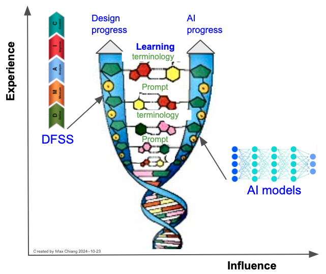 This brings me back to the concept of “learning” as another answer—especially with AI as an ally in this process. I’ve been developing a design thinking model, which I’d like to share with you all (see attached image). Its core inspiration comes from the double helix structure of DNA. One strand represents the iterative design cycle of DFSS (Design for Six Sigma), while the other embodies the evolution of AI models. It may seem unconventional, but I believe it has potential for further exploration. Combining years of hands-on experience with this framework for design thinking could open up exciting opportunities, perhaps a Master in a specialized field.