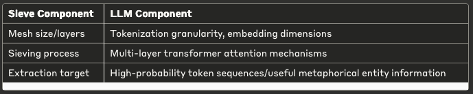 Sieve ComponentLLM ComponentMesh size/layersTokenization granularity, embedding dimensionsSieving processMulti-layer transformer attention mechanismsExtraction targetHigh-probability token sequences/useful metaphorical entity information